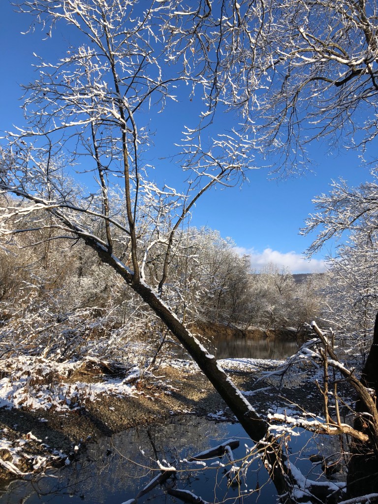 The snow was wet enough that it coated the trees and turned the brown of winter into a thing of shimmering, silent wonder. I couldn’t persuade anyone to come out and make a snowman with me. But Kiko was delighted to play catch with the frisbee, and chased a few snowballs. Even shoveling off the sidewalk and driveway was good and fun exercise. Later in the day I walked to the Reservoir Road entrance of Seven Bends State Park.