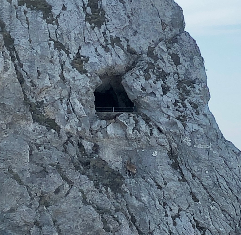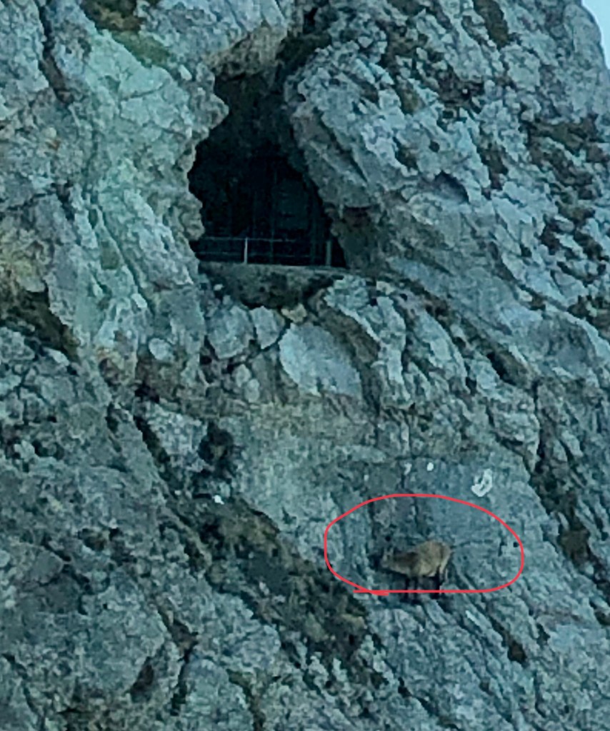 We sat next to some windows that faced the summit. Snow lingered on ledges. An opening to a shallow cave sat just about eye level, and I could see the shadows of a few hikers standing in the cave’s opening. I sat looking at the stunning grandeur of creation without looking for anything in particular. Then I noticed something on the ledge below them, an animal of some kind. I wondered aloud, “Is that a mountain goat?” The people at the next table, binoculars in hand, overheard me and replied, “It’s an Alpine Ibex. We’ve been watching it for a while.”
