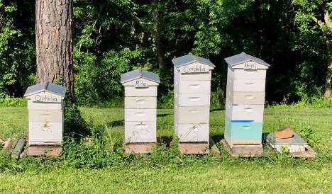 Walking towards the Abbey chapel from the retreat house, I spied what I thought were some headstones off to the side. I figured that was where they buried their dead. But as I got closer, I realized they were beehives. Closer still, I could see that each one bore a name, “Ophelia, Rita, Cordelia, Abbigail,” and one I couldn’t quite read without risking a sting.