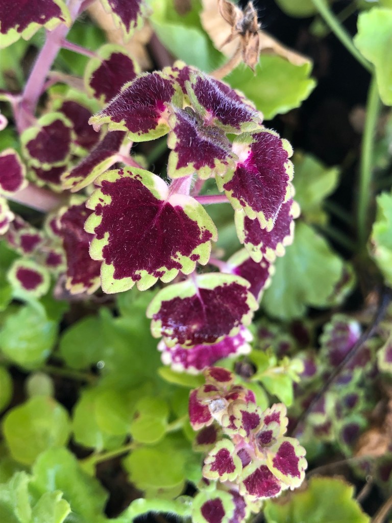 I unintentionally messed up. I planted three annuals in a large pot, a small-leaf coleus for height and contrast, an unidentified run-of-the-mill pink petunia, and a Headliner Night Sky petunia. The Headliner petunia was a gift. I was determined to nurture and propagate it so that I could share a well-rooted cutting with the gift-giver. They were all small when I repotted them, and I assumed there was room for all three to grow.