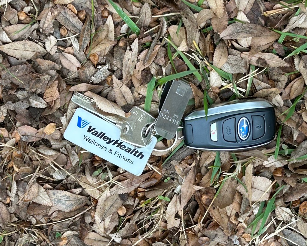Lying amidst grass and leaves was my key ring, sporting the key fob for my car, a house key, a church key, and my fitness center card, all still attached to the belt clip that was supposed to be on my belt. I have no idea how the clip jumped off my belt although in hindsight it is possible that I had failed to put the clip fully on my belt, something that has not happened before.
