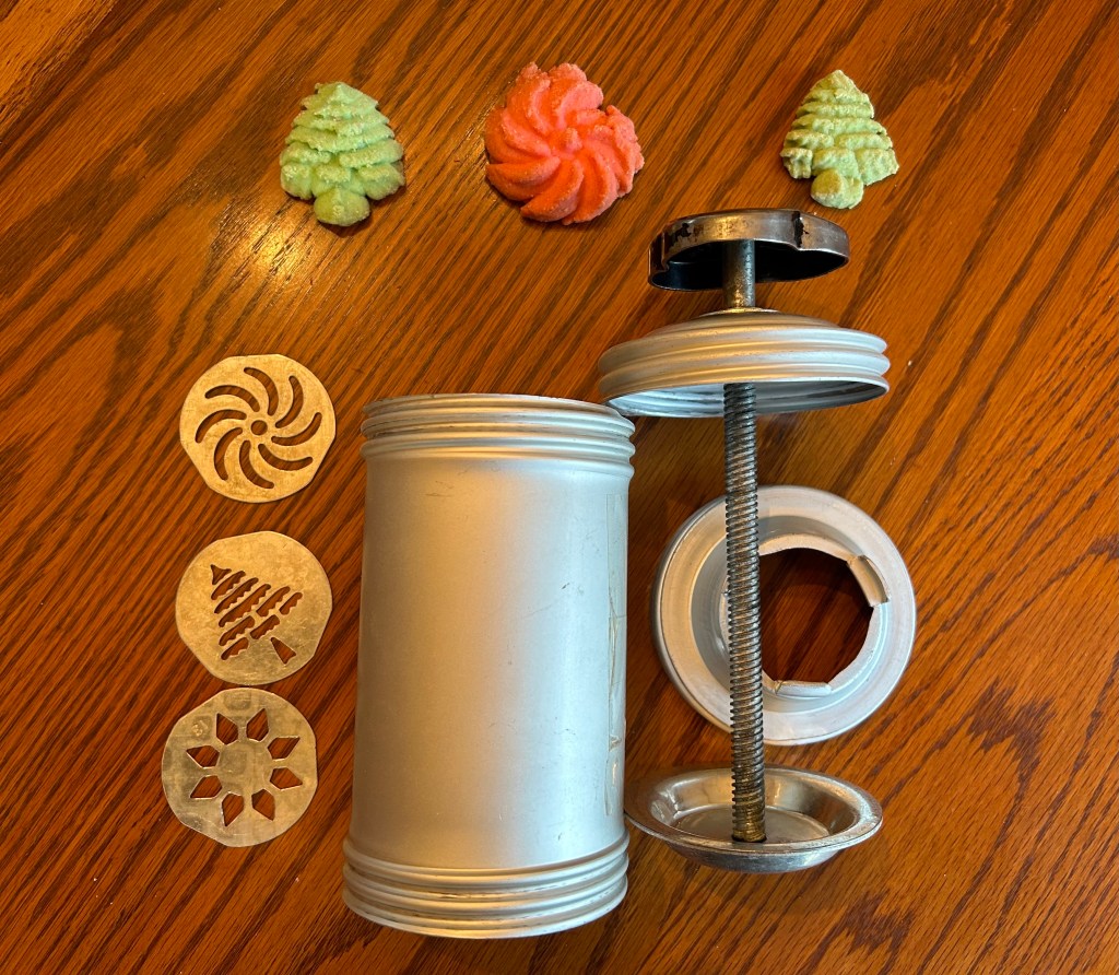 There were as many different recipes as participants, and each was shared in such a way that each one morphed into entire stories that included multiple family members and changing materials and measurements. I learned that Fluffo was a brand of shortening, not marshmallow cream, and that lard (a favorite ingredient in almost every recipe) came in something called a firkin (a wooden cask that held about 10 gallons). We had a lot of laughs as we talked about making root beer (made with McCormick’s root beer flavoring), Half Pound loaves, bread which only turns out with King Arthur Flour, raisin cookies that required all hands-on deck to make, German sweet bread which required the strong arms of a man to mix it thoroughly, and spritz cookies made with a grandmother’s vintage Mirro cookie press.