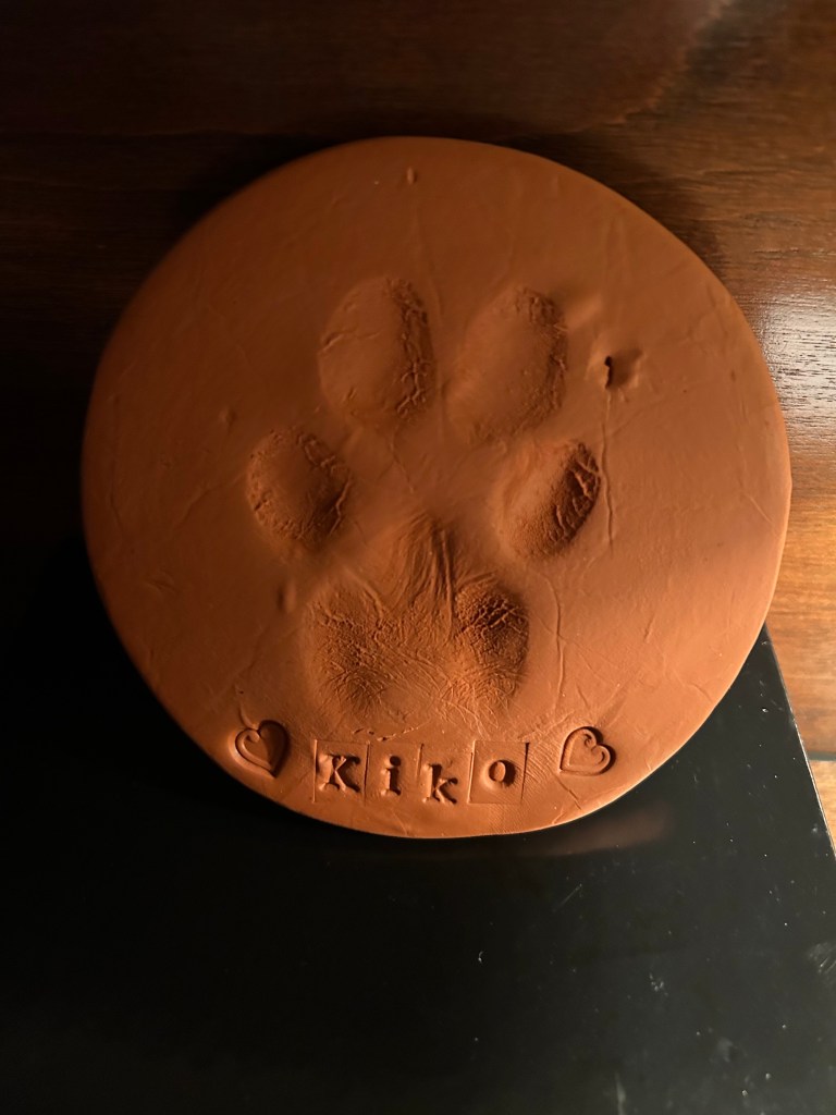 It was like that when I got the call that his ashes were ready. I walked to the vet’s following a route Kiko and I would often take on our way to Seven Bends State Park. The receptionist brought him out to me with tears in her eyes and handed me the bag. I chose the long way home for this final walk. It wasn’t until I got home that I noticed a clay paw print of Kiko in the bag, next to his ashes. It was a lovely surprise and a wonderful keepsake.