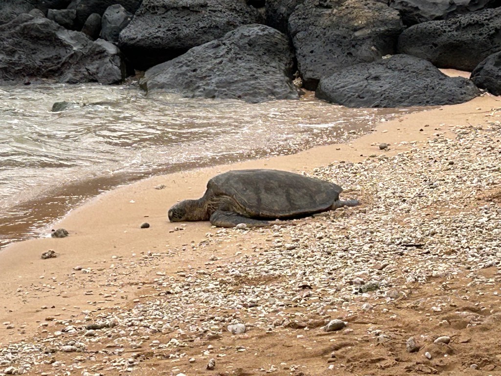 An example. The first morning on Maui, I discovered a honu, (Hawaiian green sea turtle) nesting on the sand in a well-protected little bay. They are amazing animals, with shells anywhere from 3-5 feet in length, weighing between 300- 400 pounds and can live to the ripe old age of 80. They are a protected species, and a symbol of longevity, safety and mana, ( spiritual energy) in the Hawaiian culture.