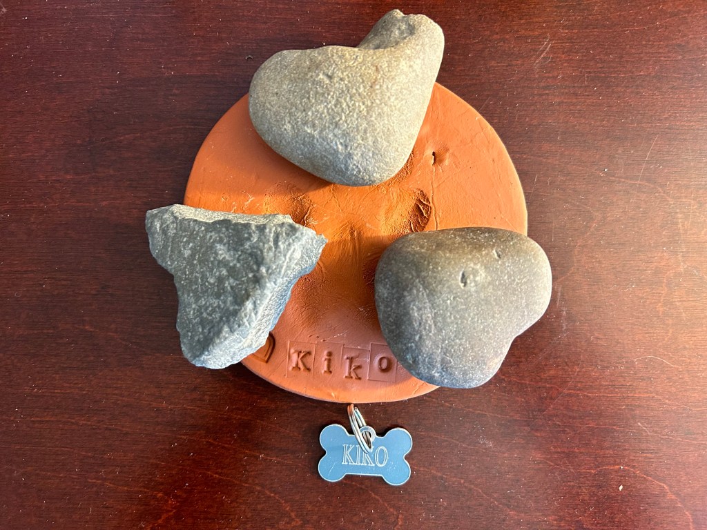So, I was surprised when I discovered that the pawprint the vet made after Kiko died had been decorated. The clay imprint was on a small filing cabinet in my office at home, and I’d put his dog tag nearby. seemed drawn to it. I didn’t notice until after they returned home that she had taken three heart-shaped stones that were sitting on a piece of driftwood on the same cabinet and Marie-Hélène had placed them like a lei around the pawprint.