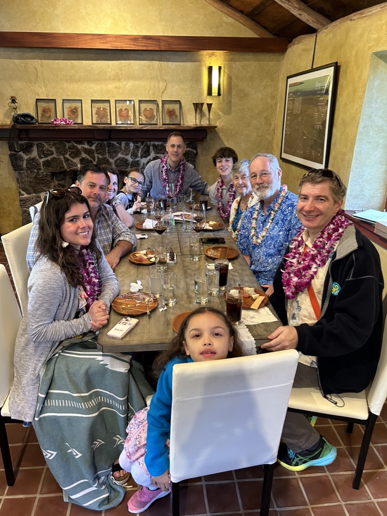 Rod and I, accompanied by our children, their spouses, and our grandchildren, drove the backside of Maui, from Kihei to Kaupo to help us remember and reflect on our wedding vows in a brief worship service at Hui Aloha Church. When the service was over, we drove back the same way to Maui Wine in Kula for light refreshments and words of thanks in what is known as the “Old Jail” building which dates back 150 years. We had soft drinks and wines, served with charcuterie boards, and assorted other snacks, and hits from the 70’s on a real record player.