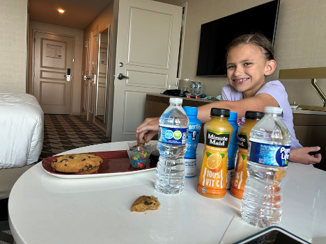 Shortly after 4 pm there was a knock on the door, and a server with a white napkin over his forearm arrived with a tray filled with three oversized chocolate chip cookies fresh from the oven, plus small bowls of chocolate syrup, caramel syrup, and mini chocolate chips. All this plus two bottles of OJ, milk and water, right to our room. Her hospitality was embodied in perfect treats for two girls and their Nana. It was certainly not deserved, but given nonetheless to strangers without complaining. That is hospitality. That is grace.