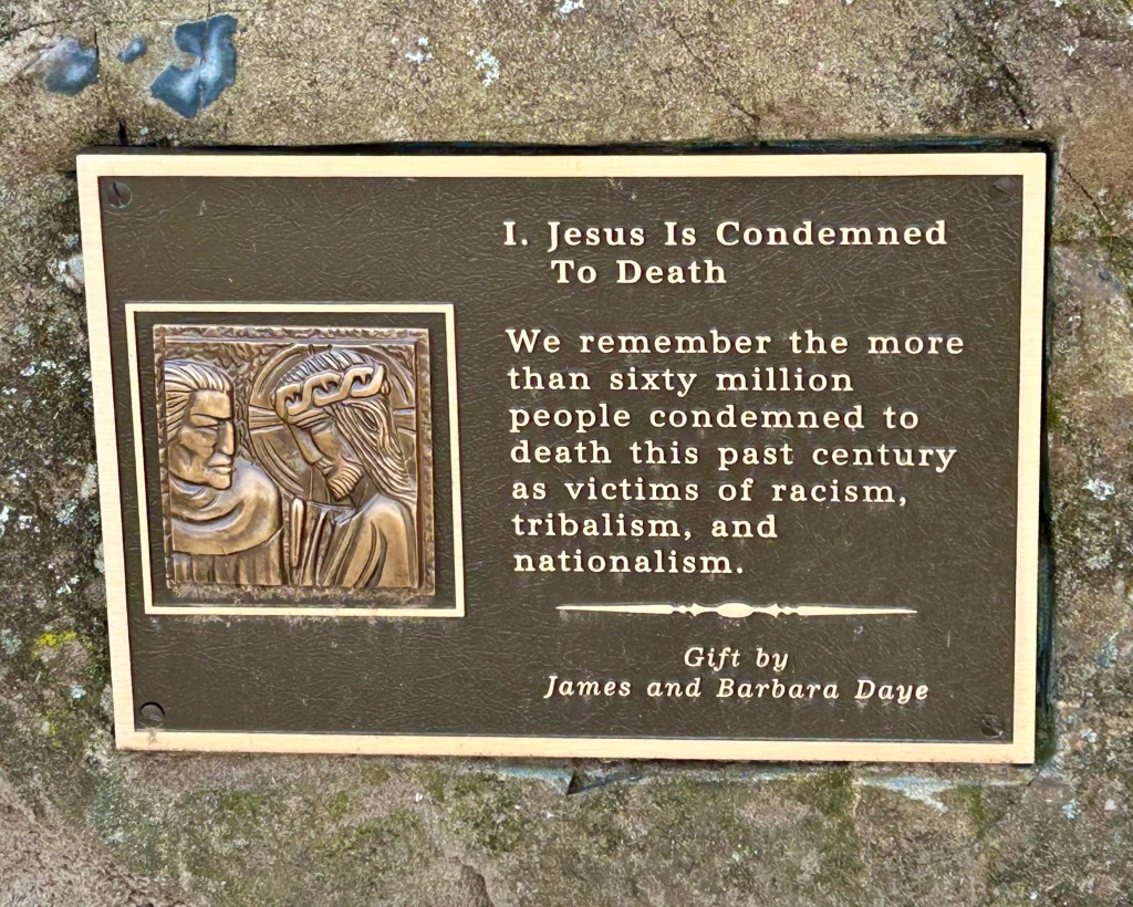 I was at St. Francis Springs Prayer Center in Stoneville, NC, late in March 2024, co-leading a retreat when I first reached out to Anthony Bell via email. All I knew about Anthony was his name, his department of corrections number, and the fact that he is on his last appeal, so he is high on the list of anticipated executions. I walked the Stations of the Cross nestled along a stream. Each of these twelve stations invites the participant to pray for contemporary situations that mirror Jesus’ last hours. The first station, “Jesus is Condemned to Death took my breath away. I immediately stopped to pray for Anthony, along with all people around the globe who have been condemned to death, many sitting on death rows because of the color of their skin, and their poverty, which prevents them from getting the best legal representation. I included the photo below in my email.